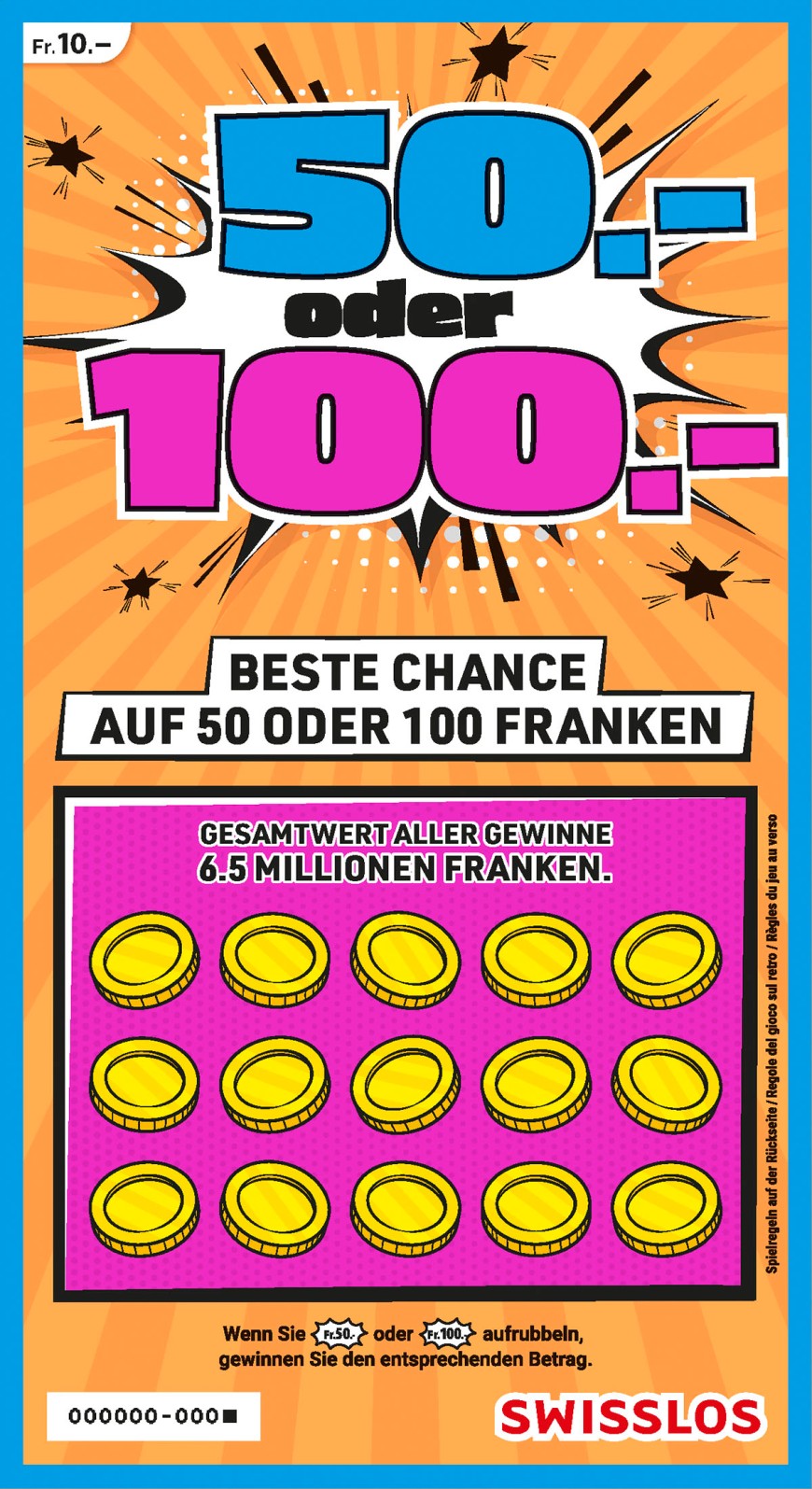 Das knallige Los besticht durch seinen einzigartigen Trefferplan, denn anstelle eines grossen Hauptgewinnes sind ausschliesslich Gewinne im Wert von 50.- oder 100.- Franken im Los vorhanden. Mit keinem anderen Los haben Sie eine bessere Chance auf einen Treffer in dieser Höhe.