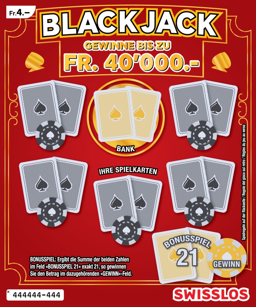 Faites mieux que la banque et gagnez jusqu'à 40'000 francs. Le billet à gratter «Black Jack», c'est comme avoir un atout dans sa manche pour pouvoir disputer de fébriles duels et gagner rapidement beaucoup d'argent.