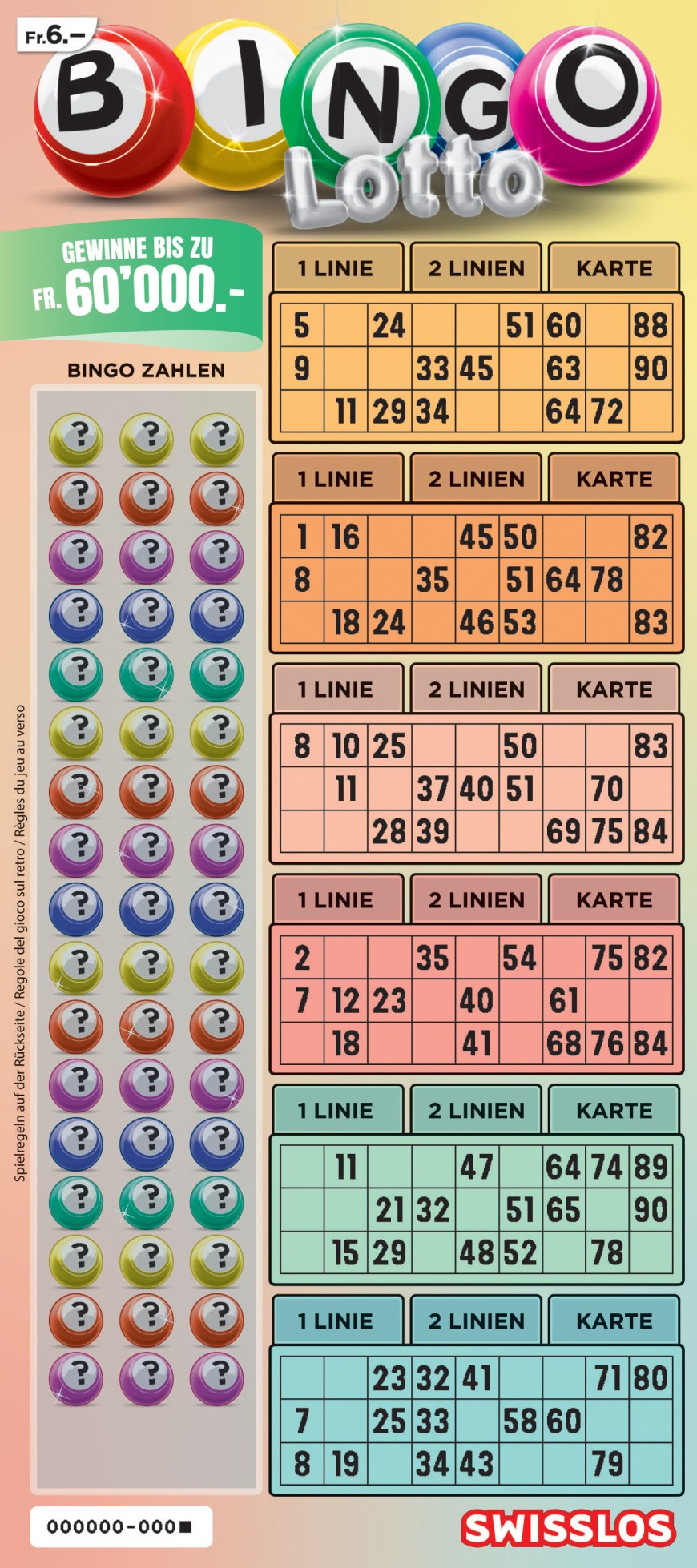 Bingoooo! Il classico «Bingo Lotto» esiste anche sotto forma di gratta & vinci e garantisce vincite fino a CHF 60'000.-. Sarà possibile grattare una linea intera o addirittura tutta la cartella? Emozioni garantite dall'inizio alla fine.